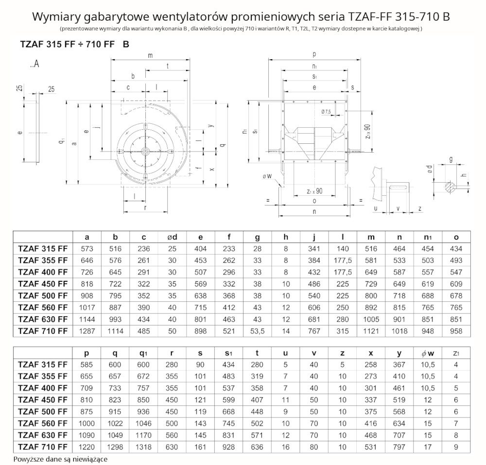 Dwustronnie ssące wentylatory promieniowe serii TZAF FF przeznaczone są do przetłaczania czystego oraz lekko zanieczyszczonego powietrza. Stosowane głównie w urządzenia wentylacyjnych, grzewczych oraz klimatyzacyjnych. Cechą charakterystyczną wentylatorów TZAF FF jest zwarta budowa, wysoka efektywność oraz niski poziom hałasu. Wirnik wentylatora z łopatkami zagiętymi do tyłu, osadzony na obustronnie łożyskowanym wale. Maksymalna temperatura przetłaczanego medium +60°C.