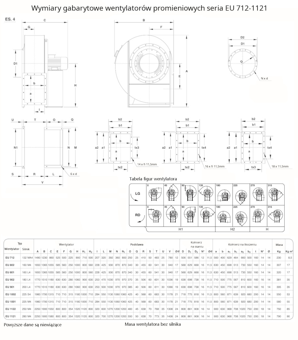 – silnik w wersji B3 dla wykonania mechanicznego ES.4 (montaż łapami silnika do podstawy wentylatora) lub wersji B5 dla wykonania ES.5 (montaż kołnierzem silnika do obudowy wentylatora).