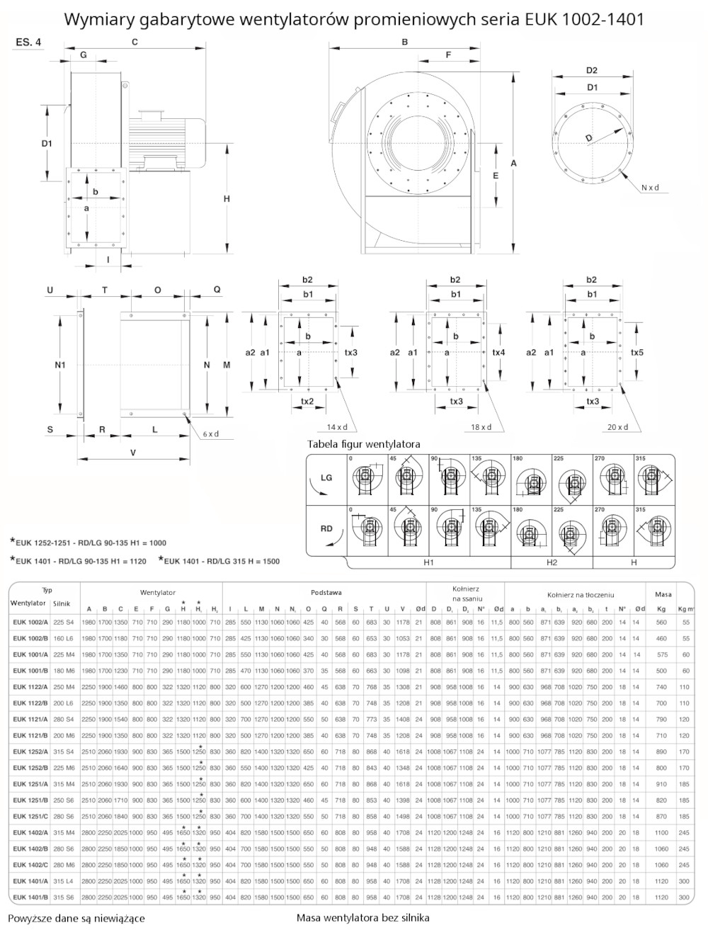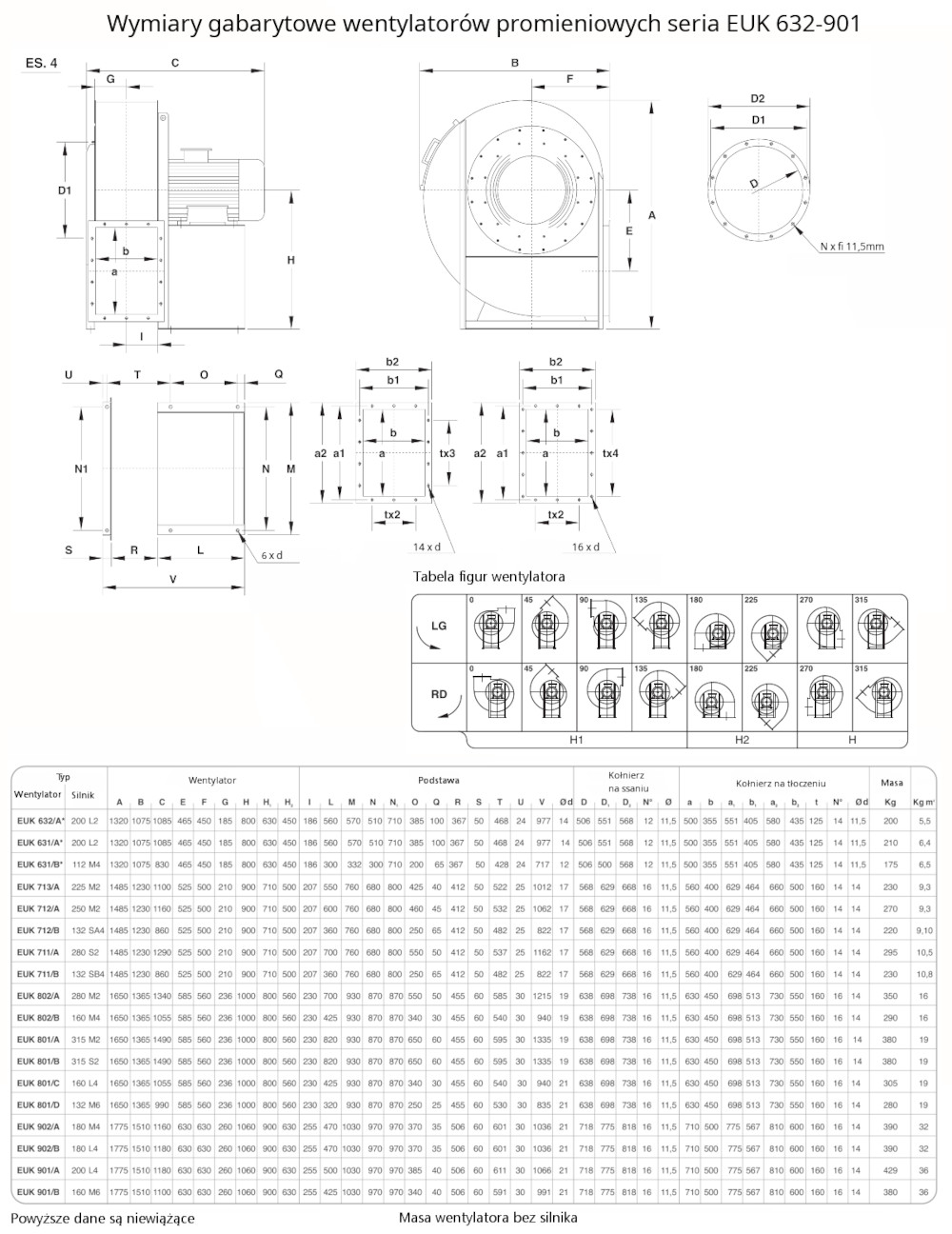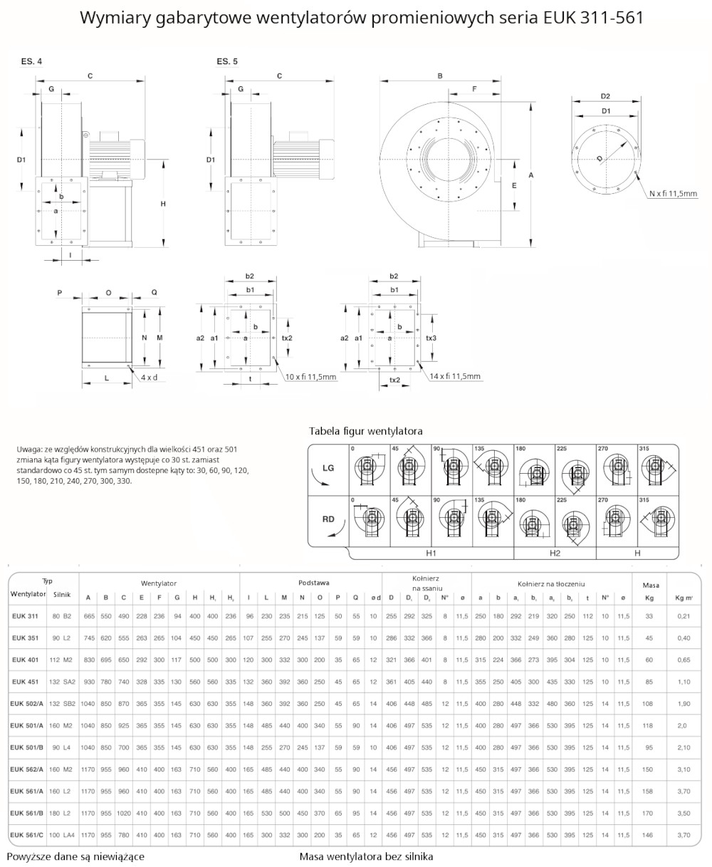 – silnik w wersji B3 dla wykonania mechanicznego ES.4 (montaż łapami silnika do podstawy wentylatora) lub wersji B5 dla wykonania ES.5 (montaż kołnierzem silnika do obudowy wentylatora).