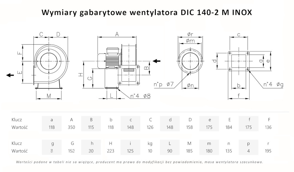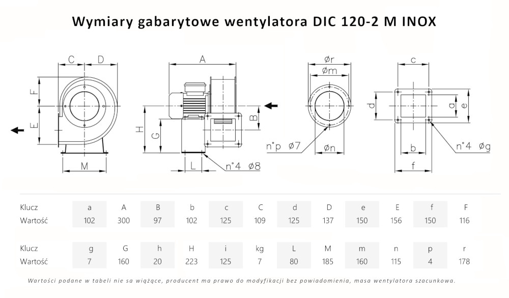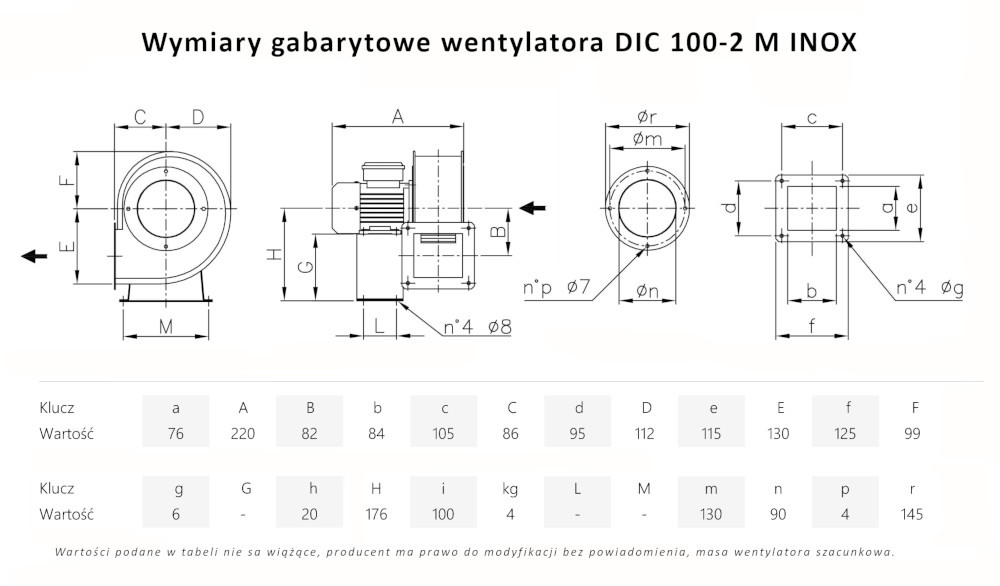 Nierdzewne wentylatory promieniowe serii DIC INOX to urządzenia niskociśnieniowe przystosowane do przetłaczania agresywnego i chemicznie zanieczyszczonego powietrza o temperaturze nie wyższej niż +80°C. Znajdują zastosowanie w instalacjach przemysłowych charakteryzującymi się niewielkimi przepływami powietrza. Typoszereg wentylatorów DIC INOX obejmuje kilka wielkości o średnicy wirnika od 100 do 180mm.
