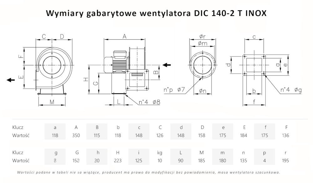 DIC 180-2T INOX wentylator promieniowy ze stali nierdzewnej